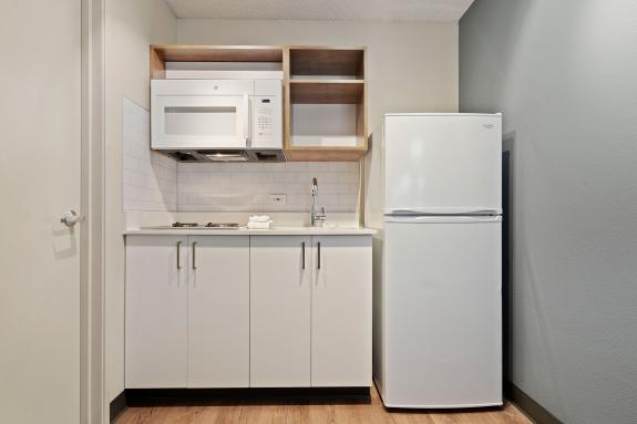 Accommodations are spacious and designed for both short and long-term stays. Guests may choose Double Double rooms with two beds for two to four guests, King bed rooms for one or two guests, or Queen bed rooms for one or two guests. All studios are equipped with Wi-Fi, flat-screen TVs, full kitchens, and spacious bathrooms. In the fully equipped kitchenette, guests will find a stovetop, a refrigerator, kitchenware and a microwave.